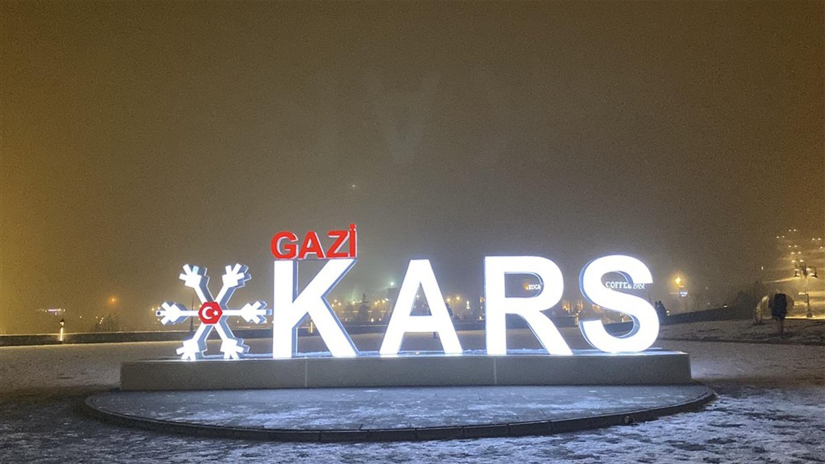Gazi Kars Bedesten bölgesindeki ‘Kars’ yazısı önünde hatıra fotoğrafı çektirenler, sis nedeniyle Kars Kalesi gözükmeyince hayal kırıklığı yaşadı. Sis gece uzunluğu devam etti.